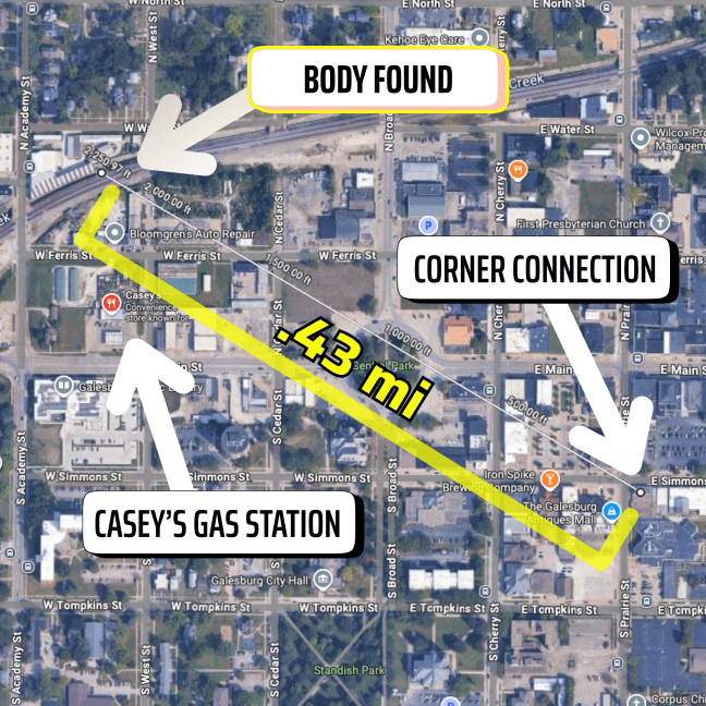 Shortly before 2 p.m., Galesburg Police Sgt. Worsfold made several unanswered calls to Tyler and asked dispatch to have the phone company ping his phone, of which came back with a location of .34 miles west of the tower at 100 N. Cherry St.