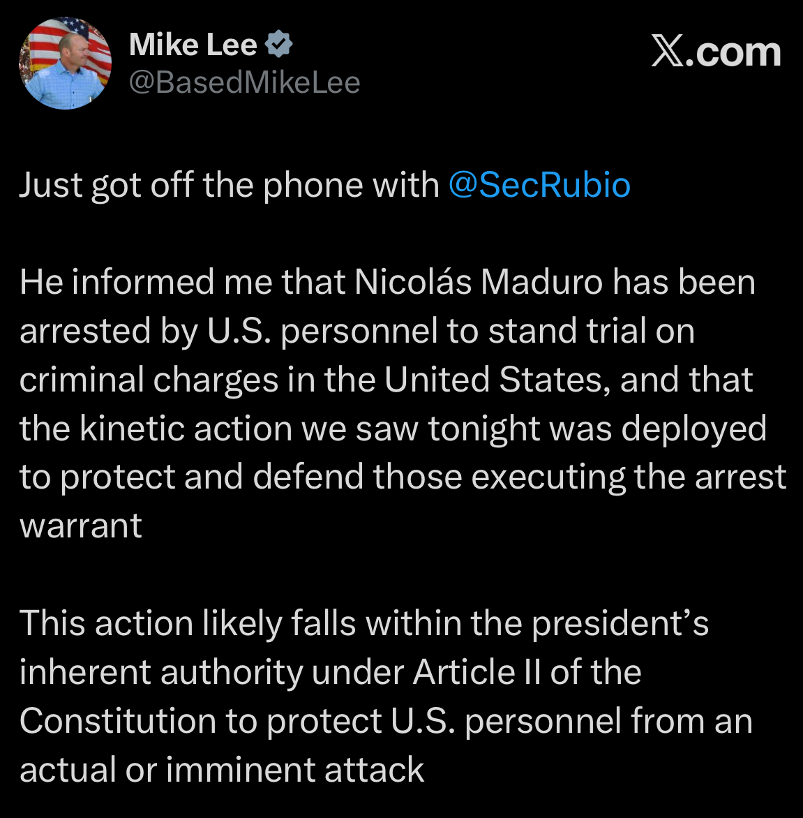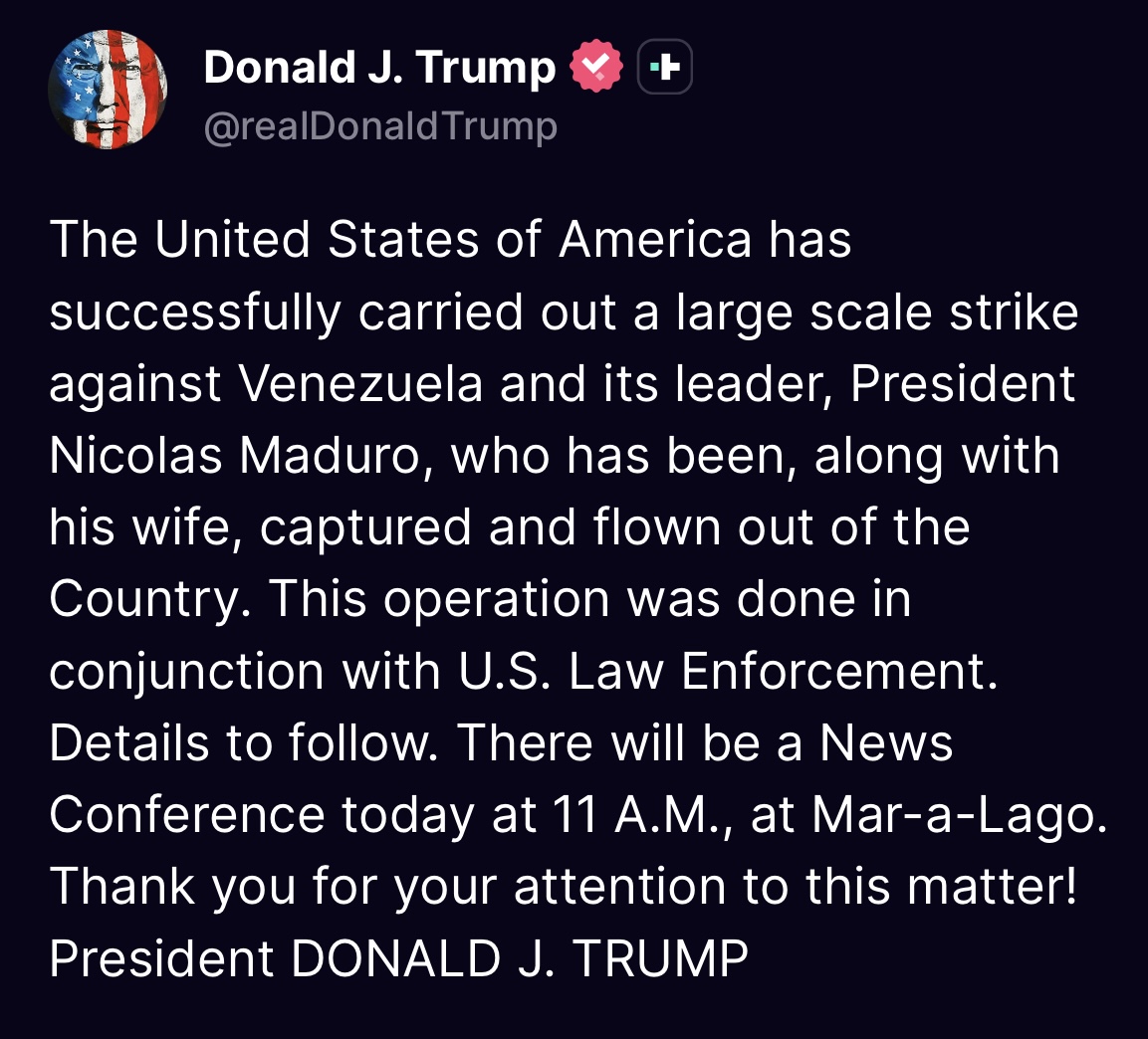 “The United States of America has successfully carried out a large scale strike against Venezuela and its leader, President Nicolas Maduro, who has been, along with his wife, captured and flown out of the Country. This operation was done in conjunction with U.S. Law Enforcement. Details to follow. There will be a News Conference today at 11 A.M., at Mar-a-Lago. Thank you for your attention to this matter! President DONALD J. TRUMP“