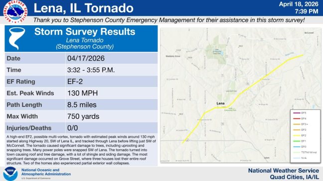 UPDATE: A preliminary damage survey conducted by the National Weather Service Saturday has confirmed high-end EF2 tornado damage in Lena.