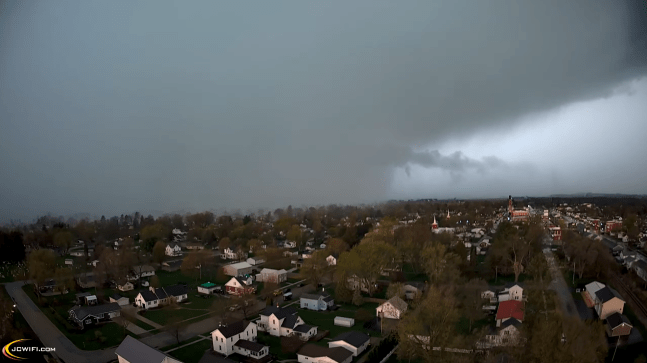 Webcam footage of rain-wrapped tornado moving into the Village of Lena. (JCWifi)